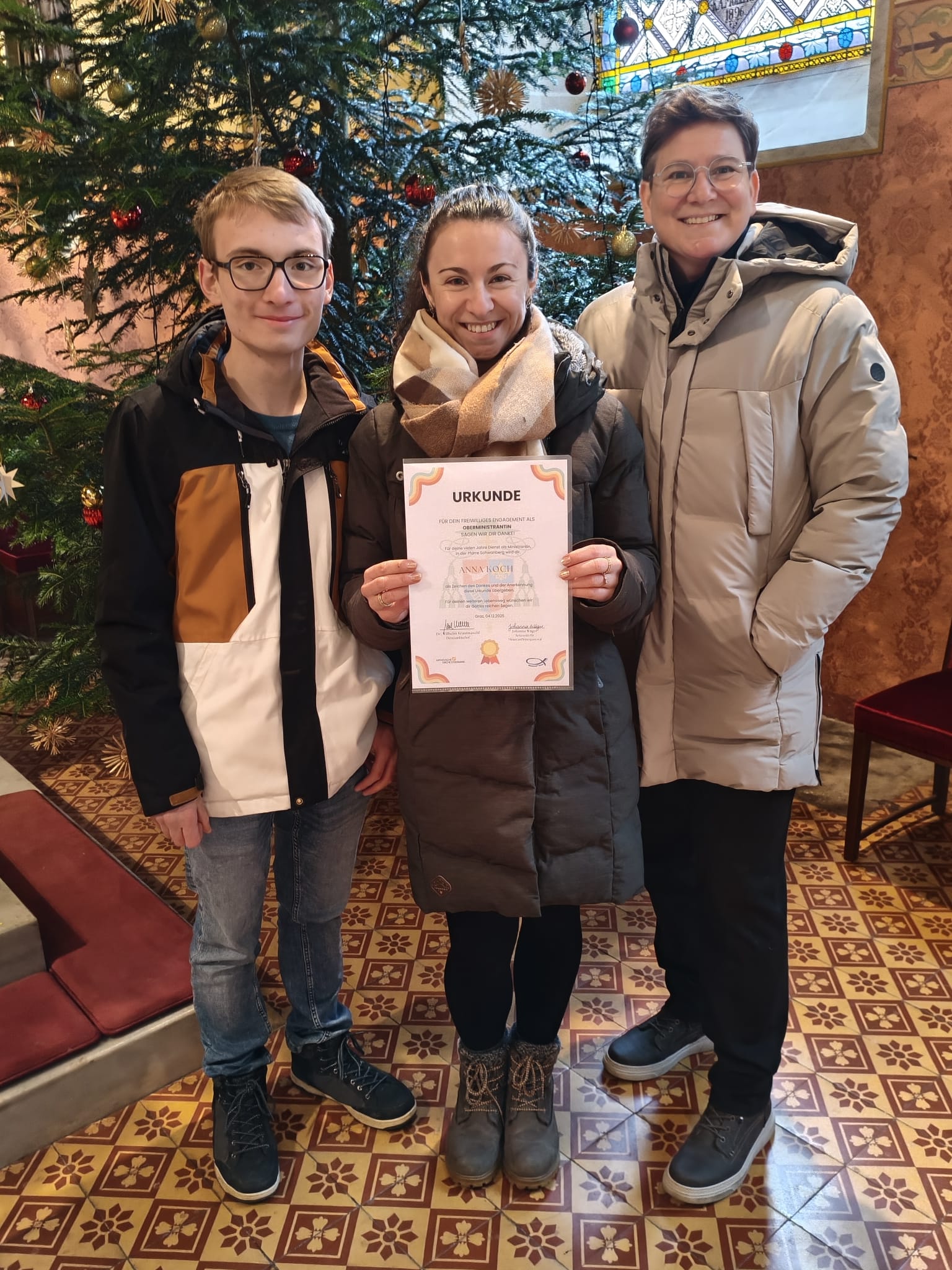 Am 4. Adventsonntag wurde unserer Ministrantenbeauftragten Anna Koch eine besondere Ehre zuteil: Diözesanbischof Dr. Wilhelm Krautwaschl stellte ihr eine Dankesurkunde für ihre langjährigen Verdienste um die Pfarre Schwanberg aus.